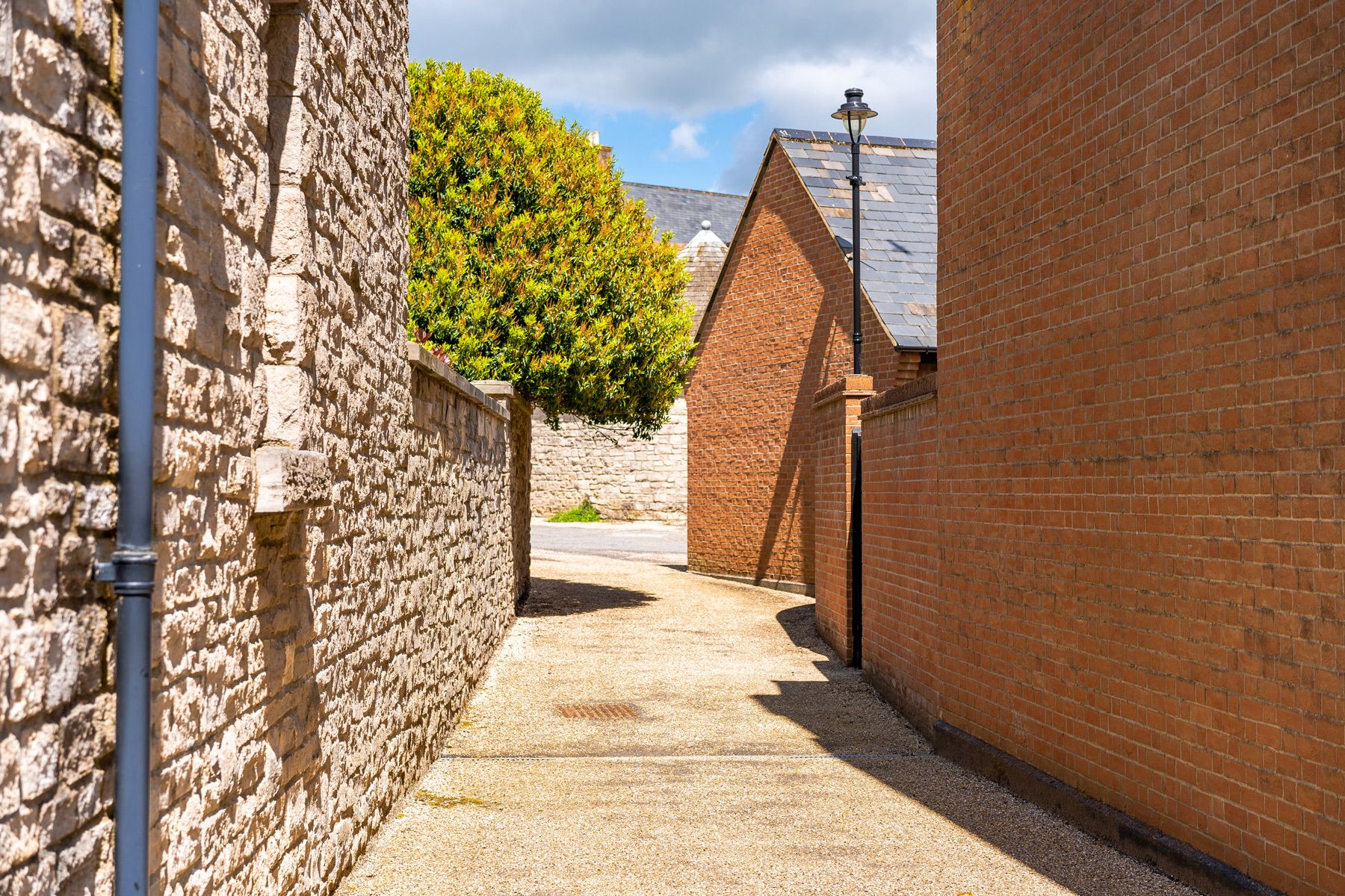 Small, narrow passageways and corridors litter the entirety of Poundbury. Lower buildings and tight front streets means opportunity for small back gardens, inner yards: use for economic, gardening or recreation. No building takes more than 3–4 seconds to walk past, providing interesting colours, shapes, shops and textures.